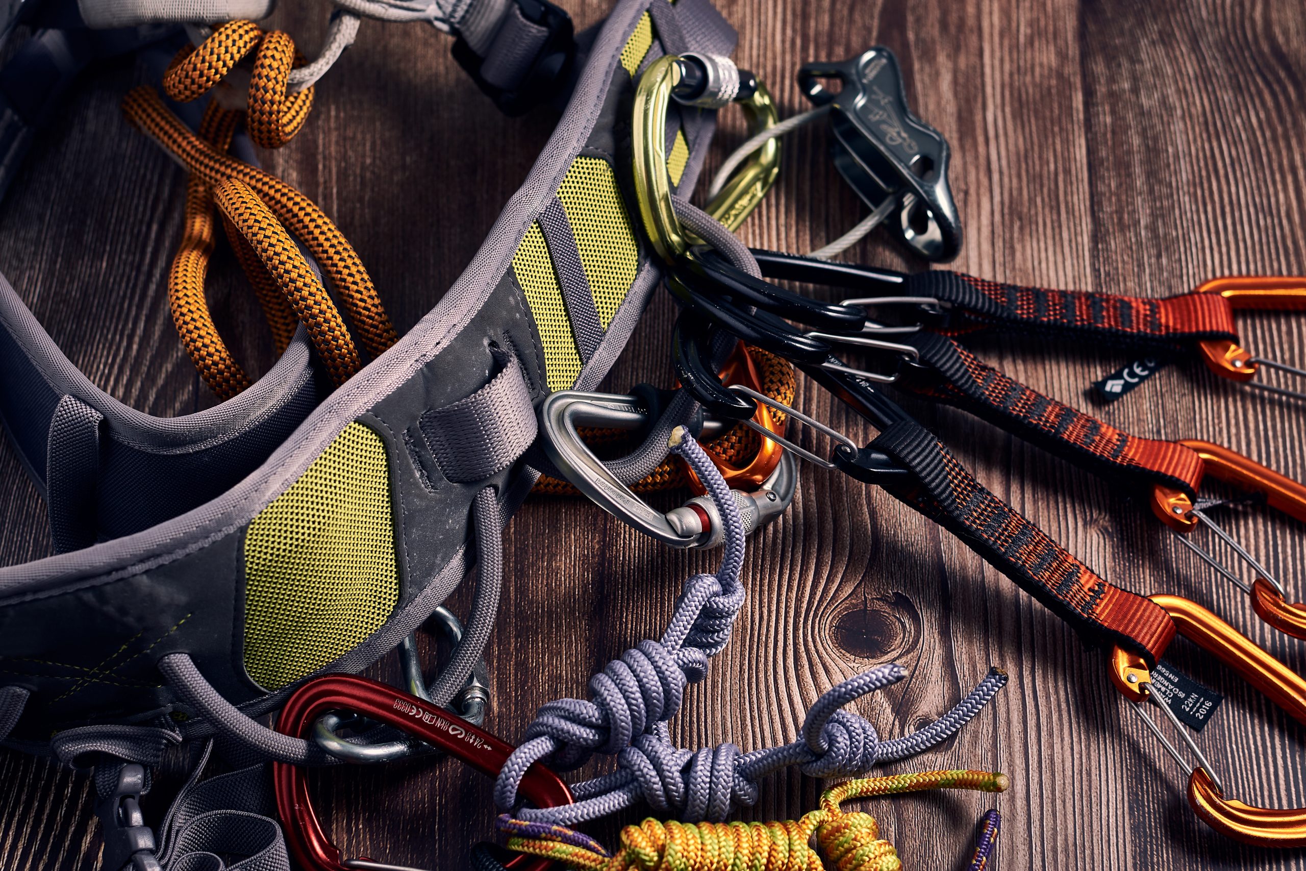 Closeup shot of many colorful climbing carabiners and knots on a wooden surface